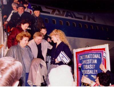 Med den sovjetiska kommunismens kollaps började tusentals rysktalande judar strömma in i Israel i början av 1990-talet. ICEJ-filialer i Tyskland och Finland erbjöd snabbt Jewish Agency att betala för en flygning av sovjetiska judar. Den 28 maj 1990 landade en speciellt charterflyg finansierat av ICEJ med flera hundra ryska judar på Ben-Gurions flygplats. Detta var den första Aliyah-flygningen som helt sponsrats av kristna och därmed är den en unik milstolpe i vårt arbete. Under de senaste trettio åren har den kristna ambassaden finansierat hundratals direktflyg för judar som vill komma hem till Israel. ICEJ har nu hjälpt nästan 160 000 judar att göra resan hem till Israel. Detta inkluderar judar från Argentina, Armenien, Azerbajdzjan, Belgien, Vitryssland, Brasilien, Kanada, Kina, Kuba, Tjeckien, Etiopien, Finland, Frankrike, Georgien, Tyskland, Ungern, Indien, Iran, Kazakstan, Kirgizistan, Lettland, Moldavien, Ryssland , Sydafrika, Spanien, Sverige, Tadzjikistan, Turkmenistan, Ukraina, Storbritannien, USA, Uzbekistan och Venezuela, bland andra.